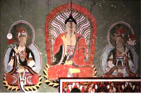 맞은 편 벽화는 아미타 정토세계의 아미타삼존상을 나타낸 도상이다. 벽면 중앙에는 역시 키형 광배를 배경으로 아미타상이 오른손은 가슴 위로