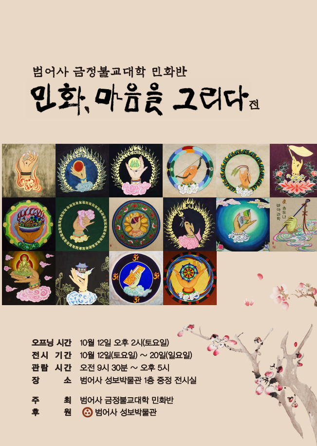 금정불교대학 전문과정 중 불교문화과정으로 운영된 민화반의 작품들을 전시한다. 3년간 전통 민화 그리기를 배우며 정진해 온 수강생들의 작품들을 직접 볼 수 있다. 이번 민화 전시의 주제는 '관세음보살 42수 수인'을 민화로 그려낸 것이다. 관세음보살의 따뜻한 손길을 온마음으로 느끼고 환희로운 시간이 되길 희망한다.