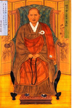 향우측 상단에는 화제가, 향좌측 상단에는 찬문이 각각 기술되어 있다. 영월당대선사가 정면향으로 염주를 쥔 양손을 무릎위에 얹은채 전신교의좌상으로 족좌대를 하고 있다. 이 작품 역시 앞서 기술한 一鳳堂 敬念大師 영정 작품과 마찬가지로 안면표현이 사진을 보는 듯 매우 사실적으로 묘사되어 있다. 장삼은 갈색과 담묵으로 음영을 주고, 담묵의 화문이 장식되어 있으며, 가사 또한 적갈색과 담묵으로 음영처리를 하였다. 바닥은 황색의 화문석이 깔려 있고 배경에는 5폭 산수병풍이 둘러져 있는데, 이 영정 역시 20세기에 제작된 작품이다. |