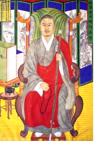 화면 향우측 상단에 녹색 바탕에 묵서의 화제가 있고, 향좌측 상단에는 황색 바탕에 묵서 찬문이 기술되어 있다. 화면 가운데 위치한 인물상은 정면향의 전신 의자상으로 족좌대를 하고 있다. 왼손에는 갈색 주장자를 바닥에 짚어 세우고, 오른손에는 암갈색 염주를 쥐고 무릎 위에 얹은 상태이다. 장삼은 담묵을 펴바른 회색으로 의습선에 따라 먹의 농도를 조절하였으며, 가사는 선명한 홍색으로 그 위에 국화문을 장식하고 있다. 인물상의 배경 벽면에는 6폭 산수병풍이 둘러져 있고, 산수화 표현이 매우 사실적이다. 그리고 향좌측 뒷면에 서책과 향로가 놓여져 있다. 바닥에는 화문석으로 추정되는 것에 황색이 칠해져 있다. |