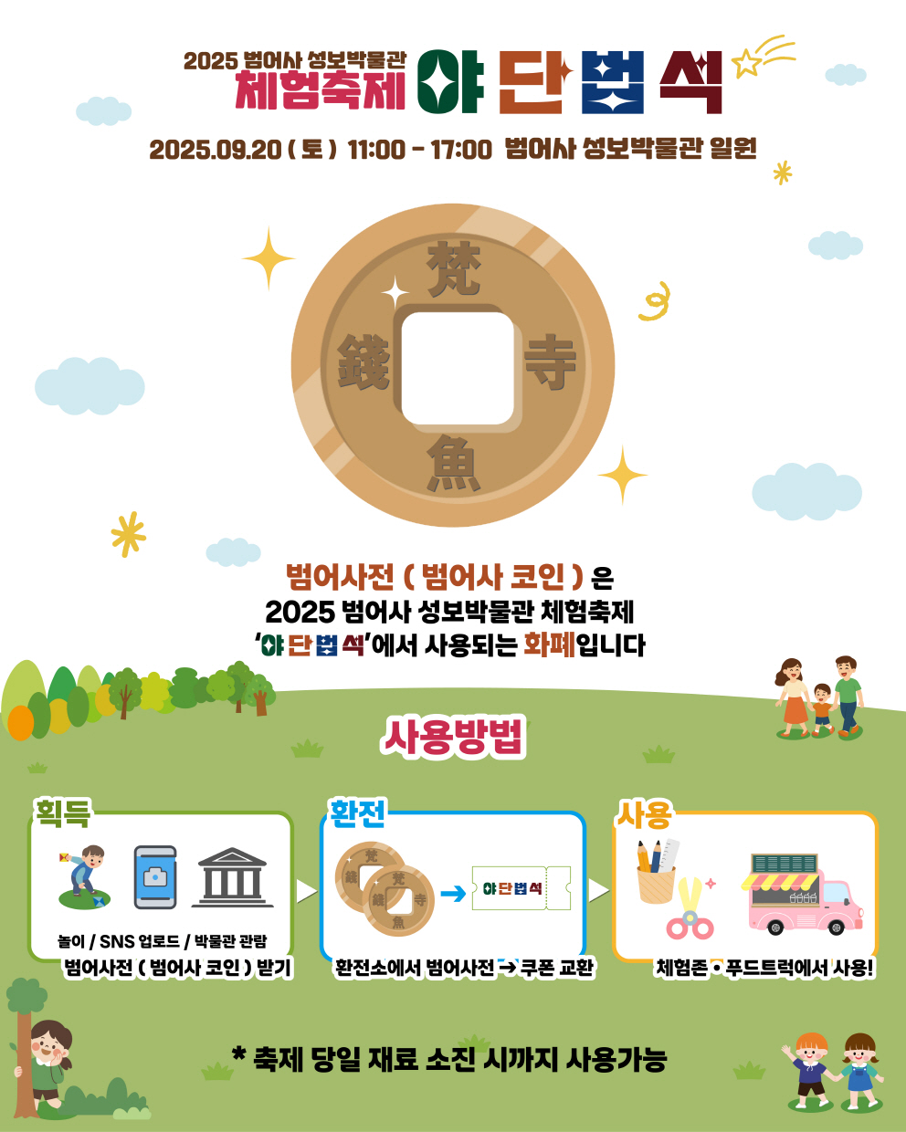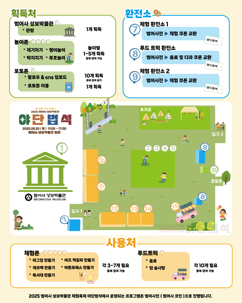 *전시 관람, 놀이 체험 등으로 획득한 범어사전(범어사 코인)으로 체험존과 푸드 트럭 이용 가능